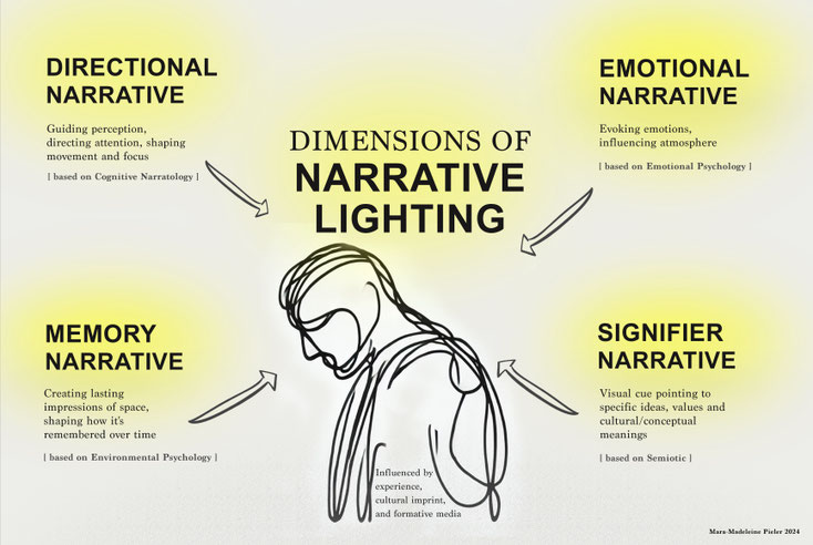 Drawing from narratology, semiotics, and environmental psychology, the work outlines four dimensions through which light can narrate: Directional (guiding attention), Emotional (shaping affect and atmosphere), Signifier (carrying symbolic or cultural meaning), and Memory (linking perception to recollection). Together, these dimensions frame light as an active agent of storytelling across stage, architecture, installation, and everyday space.